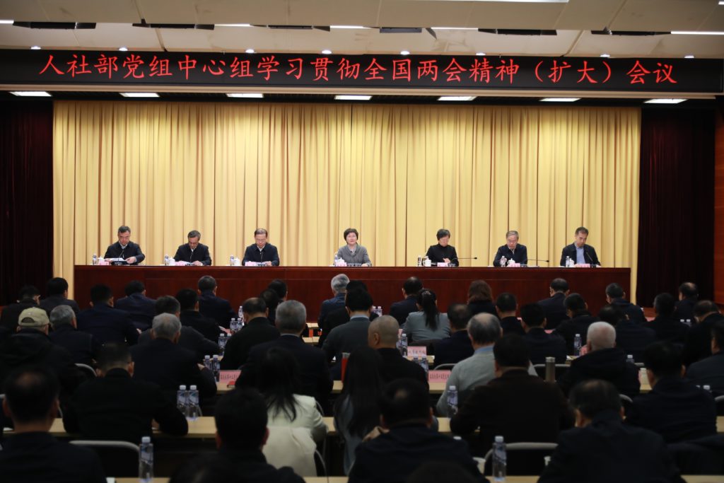 3月13日,人力资源社会保障部党组召开理论学习中心组学习扩大会议,传达学习全国两会期间习近平总书记重要讲话和两会精神,部署推进贯彻落实工作。部党组书记、部长王晓萍主持会议并讲话。部党组成员出席会议。