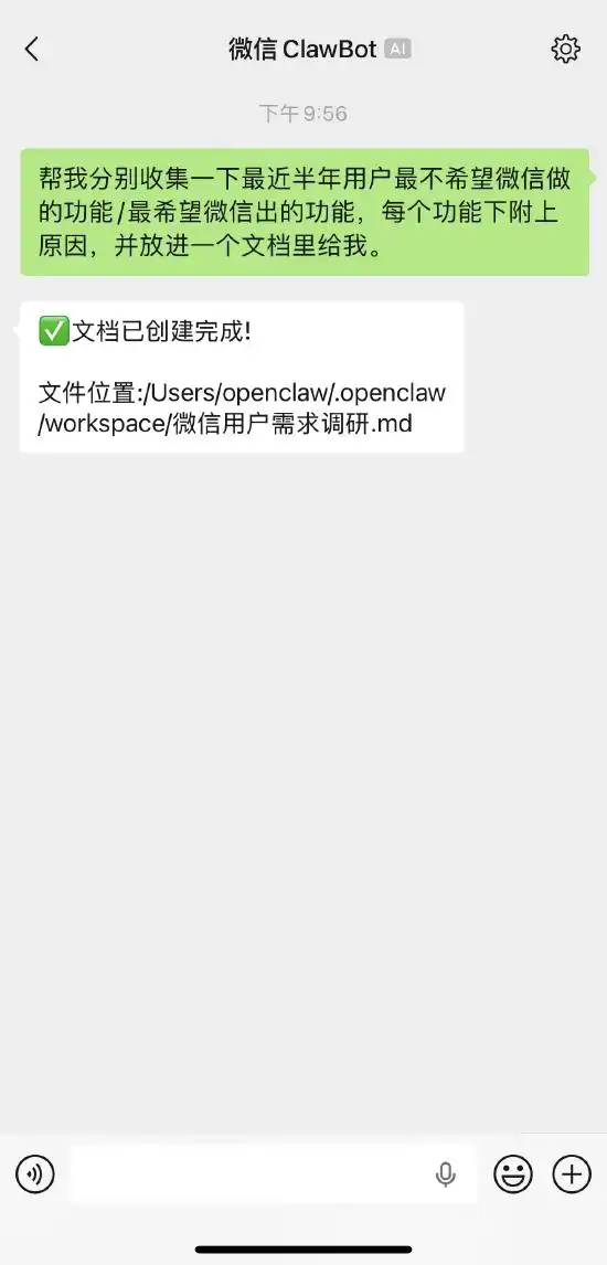 在社交媒体上,有用户实测微信ClawBot发现,“它更像是你的微信私人助理,执行你的指令,比如当你直接和它说1 分钟之后提醒我起来喝水。你就能看到 1 分钟后,他会主动给你发一条微信消息,真的会提醒你。”