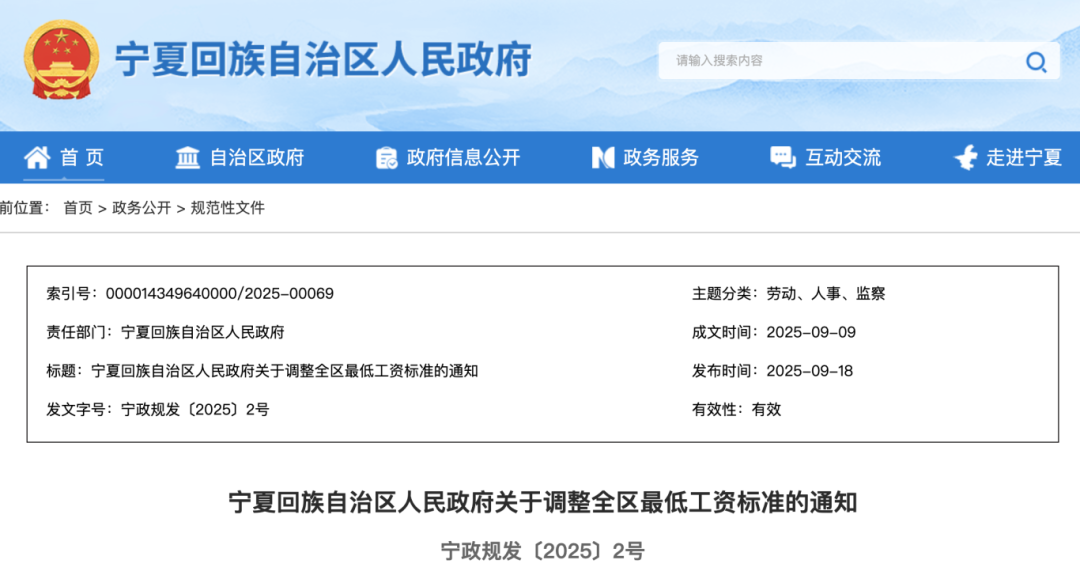 浏览量: 153 9月18日,宁夏回族自治区人民政府发布《关于调整全区最低工资标准的通知》。