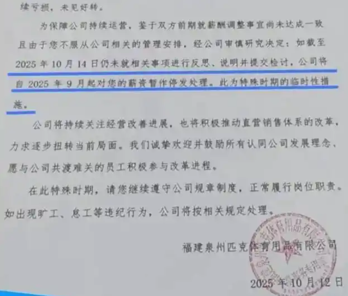 网传通知显示:“为保障公司持续运营,鉴于双方前期就薪酬调整事宜未达成一致且由于您不服从公司相关的管理安排,如截止到10月14日仍未就相关事项进行反思、说明并提交检讨,公司将自2025年9月起对薪资暂做停发处理。”