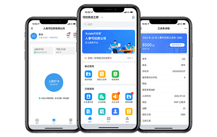 可拉熊员工端提供各类在线员工服务,高效率地完成员工入转调离,档案维护及更新,各类制度下发签收,各类证明线上开具,考勤打卡、审批、电子工资条等员工服务功能。