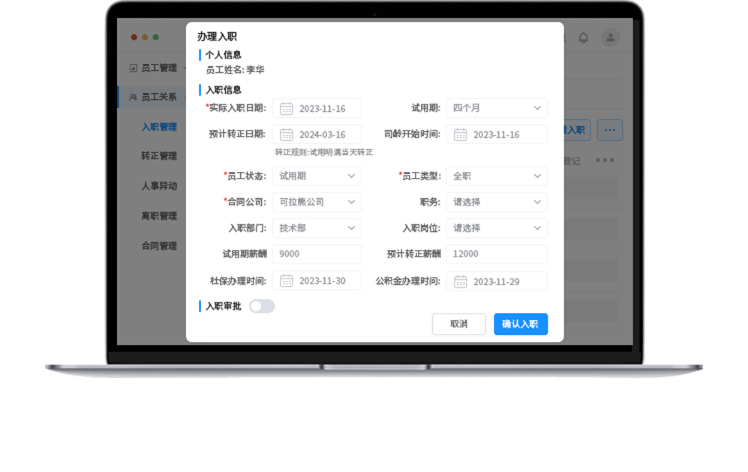 新员工入职走入职审批,到几个相关部门逐一去审批签字,耗时耗力。同时可能还会遗漏相关信息,导致信息错误或后期忘记了事务的办理。比如社保公积金什么时候去办理。