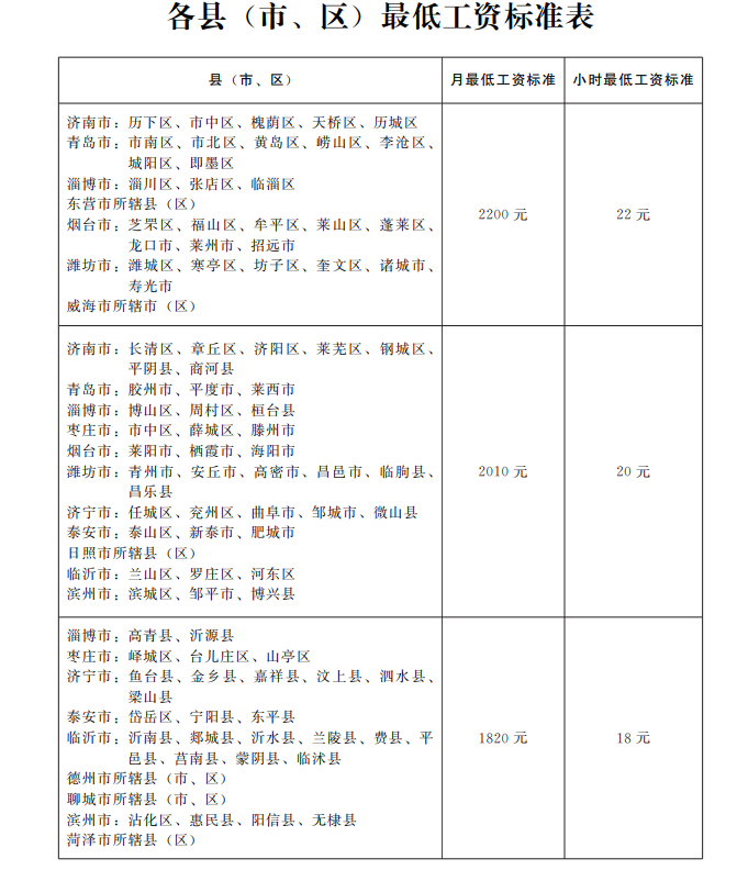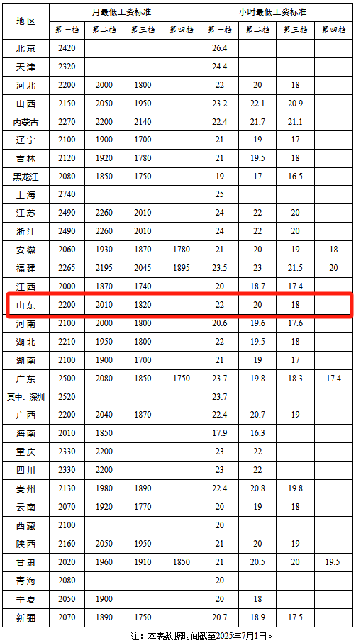 其中山东省第一档月最低工资标准为2200元,第一档小时最低工资标准为22元。